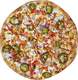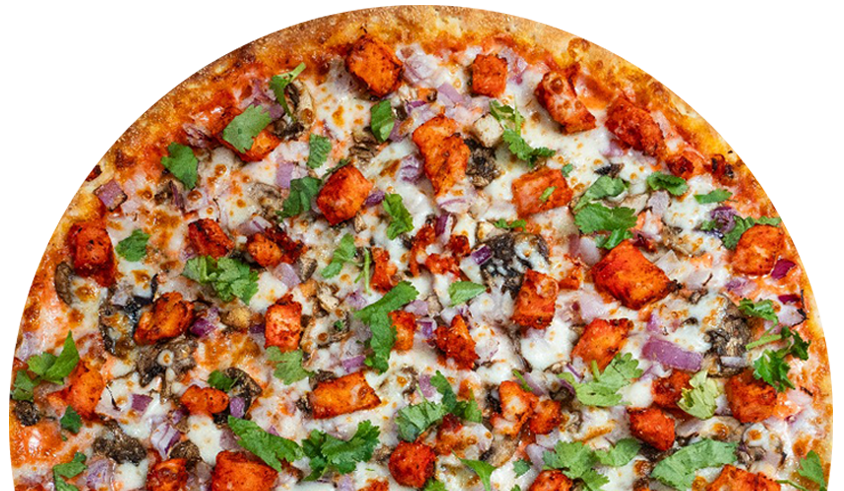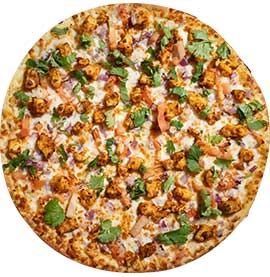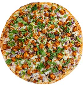 Red Sauce, Cheese, Red Onions, Bell Peppers, Chicken Marinated in Spices & Fresh Cilantro