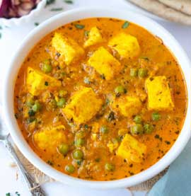 English peas with cubes of farmer's cheese in a light ginger & onion sauce