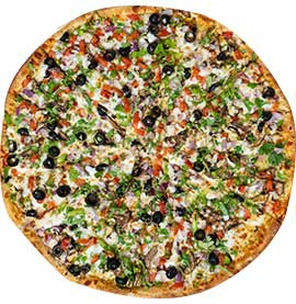 Red Sauce, Cheese, Mushrooms, Red Onions, Black Olives, Green Pepper, Artichoke Hearts & Fresh Tomatoes